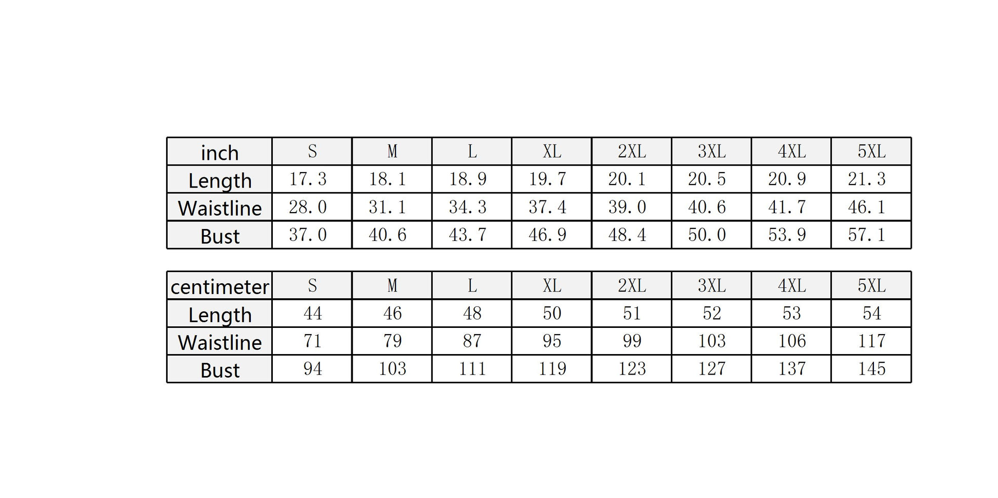 | Centimeter | S | M | L | XL | 2XL | 3XL | 4XL | 5XL |